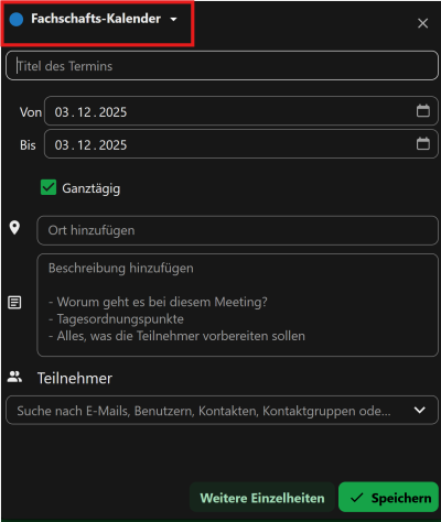 Um Termine hinzuzufügen, wende dich bitte an den Vertretungsvorsitz, den Ratsvorsitz oder uns Admins. Zur Freischaltung benötigen wir deine sciebo-Kennung! Nach erfolgreicher Freischaltung, könnt ihr bei Erstellung eines neuen Termines den Fachschaftskalender an der oberen Seite auswählen.