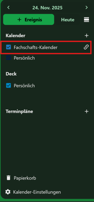 Ihr solltet den Kalender nun auf der linken Seite in eurer Sidebar sehen